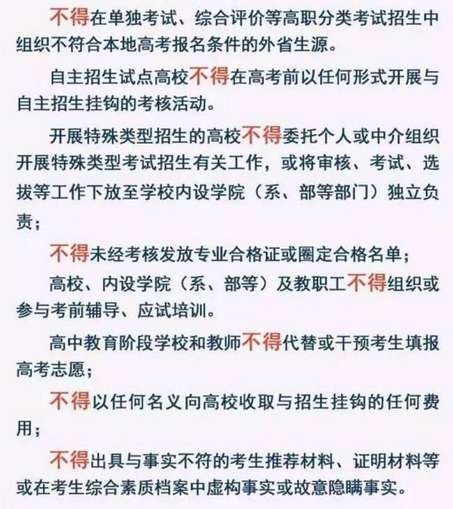 各高校不得发布未经主管部门备案的招生章程或者进行虚假招生宣传;不得无计划或擅自突破计划规模进行招生或违反计划管理要求调整计划;不得擅自规定男女生录取比例;不得擅自扩大自主招生、高水平运动队、高水平艺术团等特殊类型招生规定的项目范围、招生计划;不得违反规定的招生程序降低标准录取考生、拒绝录取符合条件的考生;不得在特殊类型招生中变更经公示的考生入选专业、录取优惠分值或录取不具备条件的考生;不得在发放新生录取通知书和新生入学报到环节更改考生录取专业;不得在新生入学后将艺术类、体育类专业学生调整到普通类专业或将外国语中学推荐保送录取的学生调整到非外语类专业;不得在录取工作结束前以各种方式向考生违规承诺录取或以“签订预录取协议”“新生高额奖学金”“入校后重新选择专业”等方式恶性抢夺生源;不得向中学、考生及家长收取礼金、礼品、有价证券或与招生挂钩的任何费用;不得避开省级招办通过中介机构或学校教师等自行组织生源违规录取考生;不得在单独考试、综合评价等高职分类考试招生中组织不符合本地高考报名条件的外省生源。自主招生试点高校不得在高考前以任何形式开展与自主招生挂钩的考核活动。开展特殊类型招生的高校不得委托个人或中介组织开展特殊类型考试招生有关工作,或将审核、考试、选拔等工作下放至学校内设学院(系、部等部门)独立负责;不得未经考核发放专业合格证或圈定合格名单;高校、内设学院(系、部等)及教职工不得组织或参与考前辅导、应试培训。高中教育阶段学校和教师不得代替或干预考生填报高考志愿;不得以任何名义向高校收取与招生挂钩的任何费用;不得出具与事实不符的考生推荐材料、证明材料等或在考生综合素质档案中虚构事实或故意隐瞒事实。