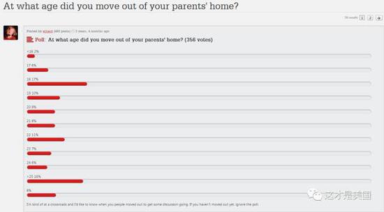 随着美国经济的下滑,这种情况有什么新变化?这才 是美国翻译Noah根据New.com.au上的数据调查和Quora上美国网友的回答,给大家还原一个真实的美国人的‘独立精神’。 作者 | Sophie Aubrey 翻译 | Noah 编辑 | 荔枝 西方文化非常看重‘独立’的价值。别说大学毕业以后了,小编老早就听说:美国人到了18岁就会离开家独立生活。 真实情况是怎样的呢? 1。 投票数据 我们先来看一组美国网站上的投票数据。 Giantbomb.com发起了一场以:‘你多大时搬出父母家的?’为题的投票活动。 (父母家???听起来好伤心。小编现在还把‘父母家’当自己家。。。Well。。。) 如下图所示,共有356人参与投票。 (虽说投票的人不多,但麻雀虽小五脏俱全,各个年龄段都顾及到了。 结果显示,18岁时搬出的占比最高,达到17%。 加上‘17岁’和‘<16岁’这两组,18岁以前(含18岁)离开父母家的占到了25%。 也就是说,四分之一的人18岁之前就搬出父母家自己住了。 另外,如果我们计算一下24岁前搬出父母家的人所占比例,数字是76%。 我们姑且把24岁看作大学毕业的平均年龄,那么可以推断:有76%的人在大学毕业后即搬出父母家,独立生活。 当然了,一个小小的网络投票可能说服力有限。下面,我们一起看看美国人怎么说。 2。 网友回帖 有位国人曾在美版知乎Quora上提问说: ‘我是中国人。上中学的时候,老师曾告诉我们说美国人大学毕业后就会离开父母独立生活。当时这让我们很吃惊。这是真的吗?’ 下面是美国人的回复。 Tom Stagliano:高级航空航天工程师(毕业于麻省理工) 在我生活的地方,一旦家里最小的孩子上了大学,父母就会卖掉房子,搬去别的地方,不会留下新的地址。。。过去几年我听说过好几例这样的事。。。 (小编给跪了。。。) Andrew Jenkins 从经历中学习 我认为这是美国文化里特别怪异的一点。 大多数情况下,如果别人知道你和父母住在一起,要么会瞧不起你,要么对待你的态度就变得轻慢了。我觉得,人们歧视和父母住在一起的人,这很荒谬。 (小编表示赞同,独立并不意味着一定不能住一起啊!) Tim Nygaard:曾就职肯塔基大学 我是迫不及待想要搬出去自己住的那种。17岁那年,我如愿搬离父母家。那是上世纪60年代,那时的美国人非常渴望独立,有很强的‘自立’意识。 现在的情况可能有所不同。经济形势不好的时候,很多人20多岁时还会搬回父母家去住。 Sean Bard:莱斯大学化学专业学士·2006年毕业,一直在美国 高中毕业后,我离开家去1,400英里(2,250公里)以外的城市上大学。大学毕业后每次回来看父母,我都没有在家里停留超过一周。我弟弟也是如此。 不过,我妹妹之前几个月住在父母家。她刚从国外工作几年回来,需要好好思考下一步的计划。 Isaac McQuistion:18岁从父母家搬出去就再没回过头 在美国大多数地区,人们的观点和文化习俗的确如此。我上大学那年搬出父母家,从那以后就没怎么在父母家住过。我的兄弟姐妹,还有我妻子,都是这样。 就像另外一篇回帖里说到的:这是美国人迷恋‘个人主义’和‘独立意识’的表现之一,同时也说明美国人信奉‘依靠自身努力实现美国梦’的理念。毕业后仍和父母住在一起,显然是一种‘耻辱’。这表明一个人未能成为对社会有用的人,而且拒绝‘长大’,缺乏独立生存能力。 可以说,这样的人就是‘寄生虫’,会受到所有亲友的侧目。人们一般不会认为和父母住的人是出自对家人的爱和依恋。 美国文化的‘主导形态’是把自己和其他人‘分隔’得越远越好。 和父母住一起的人,形象是这样的: 30多的大男孩,住在父母家的地下室,打着电动,从父母的冰箱里拿东西和饮料填肚子,苟活人世。 同样地,如果子女搬出去后,父母常常跑去子女家,也会被视为过度介入子女生活、缺乏自理能力、不尊重孩子独立生活的权利等等。 其实仔细想想,和子女保持过分的距离恐怕会让老人非常孤独。 尽管美国现在的情况基本上仍旧和我上面说的差不多,但其实已经开始改变了。 不合理的学生贷款债务,再加上很多行业薪水不景气,使得美国出现了越来越多‘几代同住’的家庭。 究其原因,无非是受困于经济状况。比起从前,现在大多数人直到上了一定年纪才买得起房。 人们仍旧认为和父母住是一种失败的表现,但是因为这种情况越来越普遍,也就从‘失败’变为‘常态’了。 匿名 其实我是英国人,但是在英国也差不多。 对于条件富足的家庭,孩子都会离家上大学,在那里租房住(或住大学宿舍),之后就不会回到父母家生活了(通常只会探望或回家休假)。 子女和父母同住,可能出于很多原因(找不到工作、入不敷出、健康原因等)。然而独立居住和生活是人们努力达到的常态。 最近,我的办公室来了一名印度交换生。我和他有过几次不错的聊天。 在聊天中,我看到我们成长的文化和童年经历非常不同。希望这可以为解答你的问题提供一些参考。 一次午饭时,我提到说自己18岁时有一阵子在一家仓库打工,负责装货盘,为上大学存点钱。 这名印度交换生非常惊讶,一个白人中产阶级家庭的孩子竟然也会干这样的工作。 他说,他的父亲绝对忍受不了让儿子做体力活这种耻辱。 就在那天,餐厅里还有一名工程总监曾做过建筑工人,一名高级程序员做过快递司机,还有其他人在工厂的流水线上工作过,有人做过邮递员。。。给我的感觉,在印度,如果子女做行业较低的工作,人